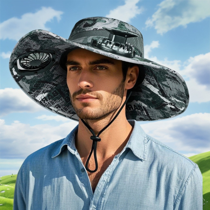 قبعة المروحة الشمسية المزودة بالطاقة الشمسية - قبعة دلو واسعة الحافة للصيد والتنزه وحماية الشمس في الهواء الطلق